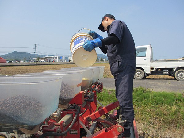 同法人では5月下旬から6月中旬にハトムギの播種を行います。森脇さんによるとハトムギはもともと〝肥やし食い〟。品種改良されたおかげでさほど難しい作物ではなくなりましたが、肥料がたくさん必要になるため、堆肥と化成肥料をバランスよくしっかり入れて土づくりをする必要があるそうです。
